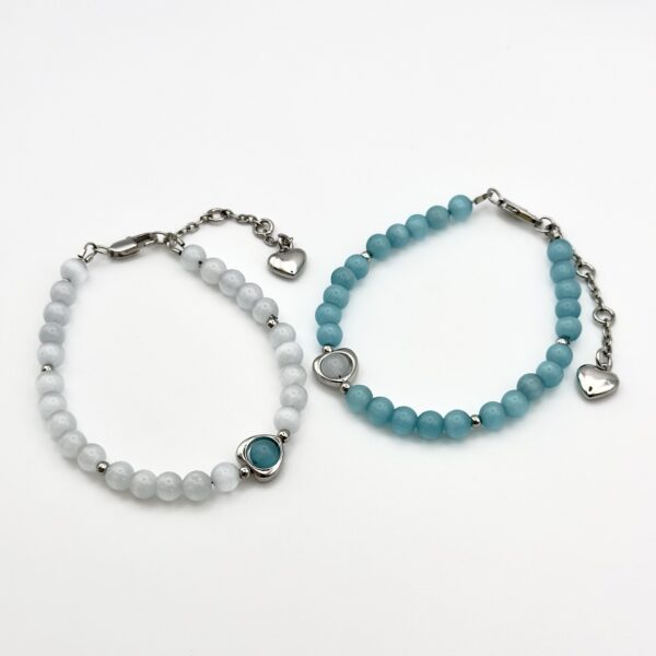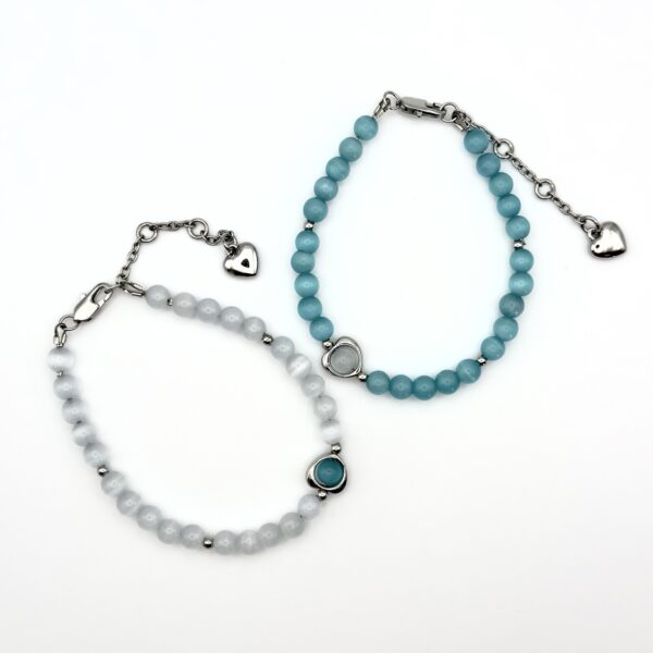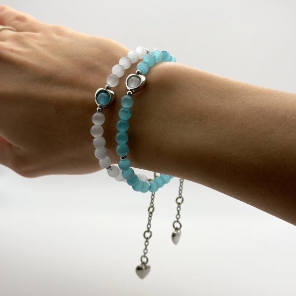 Набір браслетів з колекції Dual Harmony з намистинами зі скла “котяче око” в біло-блакитній гамі символізує гармонію і баланс. Родієва фурнітура підкреслює сяйво, а довжина 19 см з подовжувачем 5,5 см і розміри 17-20 забезпечують зручну посадку. Два браслети можна комбінувати за настроєм, створюючи різні акценти.