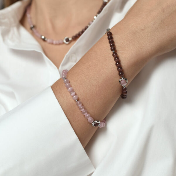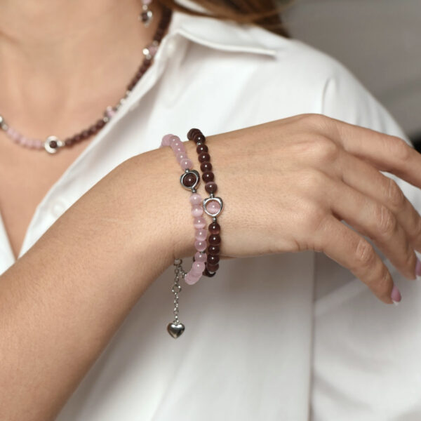 Набір браслетів з колекції Dual Harmony з намистинами зі скла “котяче око” в рожево-бордовій палітрі висловлює ідею балансу. Родієва фурнітура підкреслює м’яке світіння каменю, а довжина 18 см з подовжувачем 5,5 см і розміри 16-19 забезпечують універсальну посадку. Два браслети можна носити разом або окремо, створюючи різні акценти.