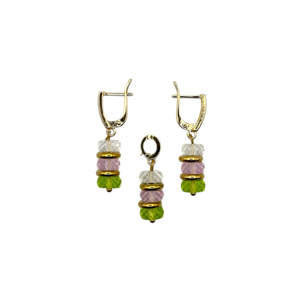 Сережки довжиною 3,5 см, вага пари – 10 г, застібка – англійський замок; металеві деталі підтримують форму і комфорт, а кулон повторює палітру, закріплюючи відчуття цілісності. Ідея колекції – колір як настрій: тут він звучить м’яко, без надмірного блиску, з акцентом на легкість лінії та акуратні переходи між відтінками.