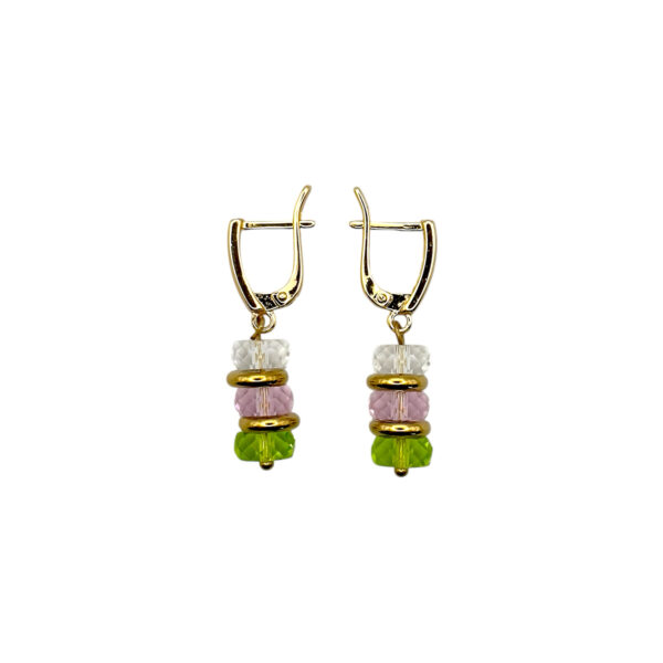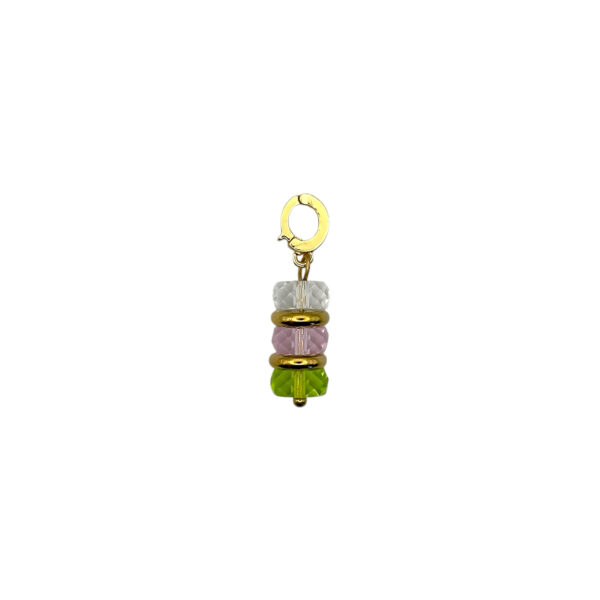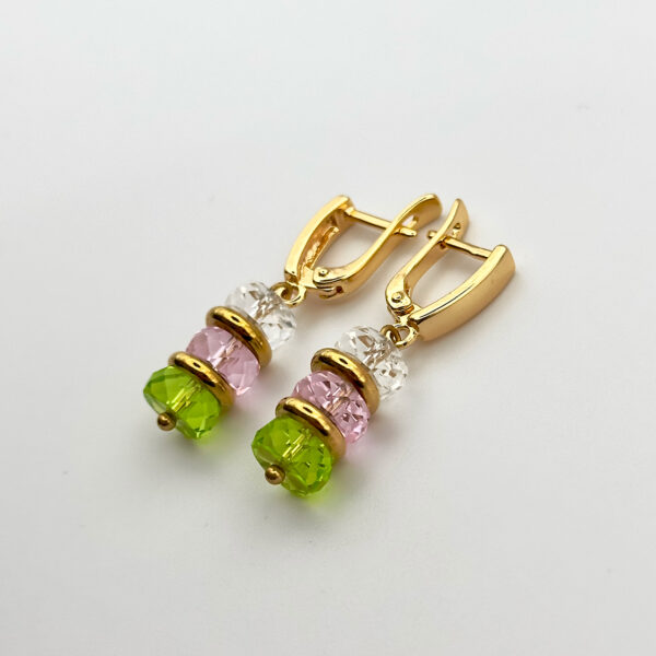 Набір із колекції Candy Beards з намистинами зі скла і металу об’єднує три відтінки – білий, рожевий і зелений – у легку, грайливу палітру. Фурнітура кольору золота 24К м’яко підсвічує колір, перетворюючи аксесуари на делікатний акцент. Скло відбиває світло рівними відблисками, тому композиція має свіжий і невимушений вигляд.