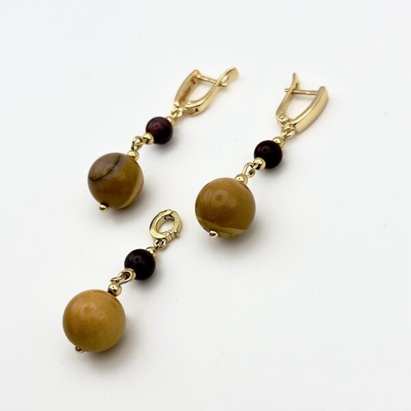 Набір із колекції Dune Sunset з намистинами з мукаїту та металу передає атмосферу заходу сонця. Жовта, коричнева і фіолетова гама створює відчуття тепла і природної гармонії, а фурнітура з покриттям золота 14К додає сяйва. Композиція має витончений і виразний вигляд.