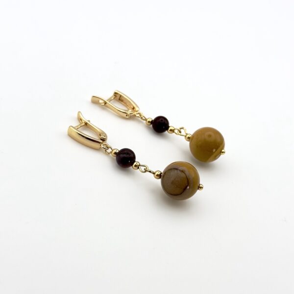 Довжина сережок – 5,2 см, вага набору – 12,2 г, застібка – англійський замок. Концепція Dune Sunset натхненна моментом, коли сонце опускається за обрій: мукаїт з переливами символізує внутрішню силу і стійкість, а металеві акценти надають ритм і форму. Кожен елемент набору зберігає природну індивідуальність завдяки малюнку каменю.