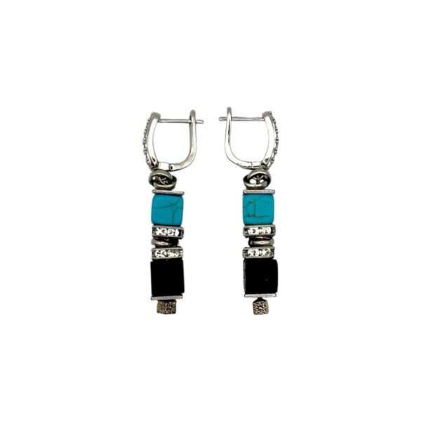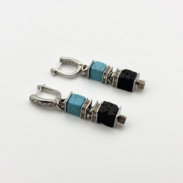 Сережки з колекції Basalt Beat об’єднують гематит, базальт, говліт і прозорі скляні намистини, створюючи динамічний контраст. Родієва фурнітура підкреслює холодне сяйво, а довжина 5,2 см робить їх помітним, але легким акцентом. Композиція має сміливий і сучасний вигляд.