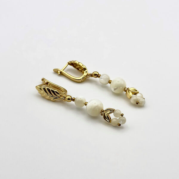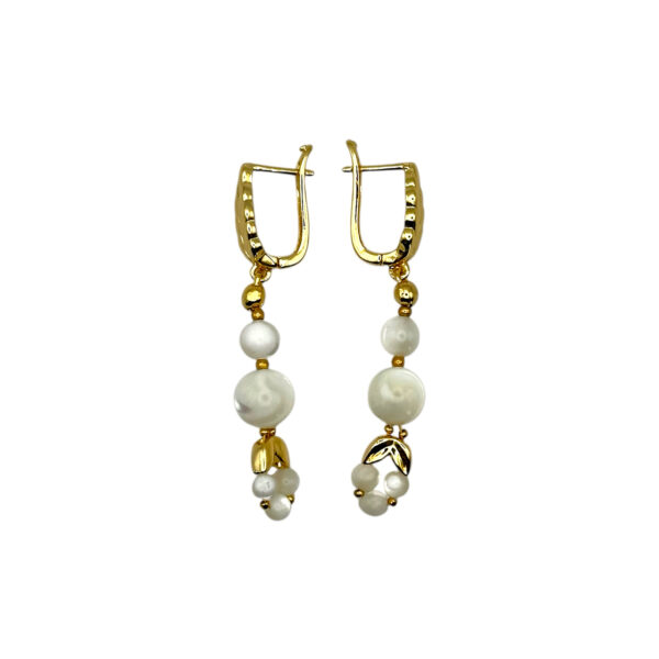 Сережки з колекції Demeter з білими намистинами з перламутру і металу втілюють ніжність і природну символіку. Фурнітура з покриттям золота 24К підкреслює тепло палітри, а витончений англійський замок у вигляді листа додає елегантності.