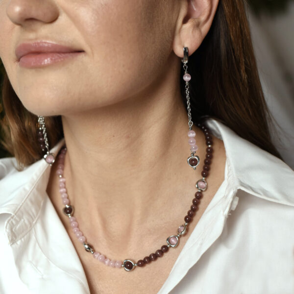Сережки з колекції Dual Harmony з намистинами зі скла “котяче око” в рожево-бордовій гамі виражають баланс ніжності та сили. Родієва фурнітура підкреслює м’яке світіння, а англійський замок забезпечує надійність і зручність. Композиція має яскравий та універсальний вигляд.