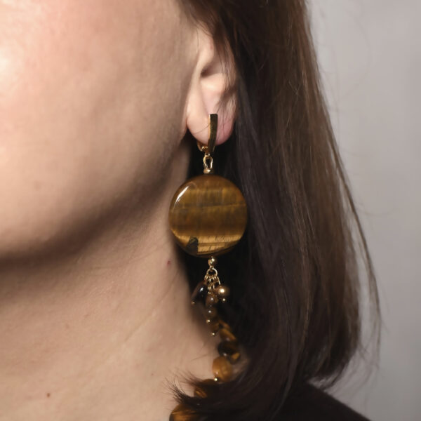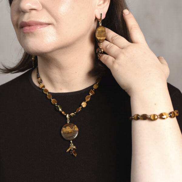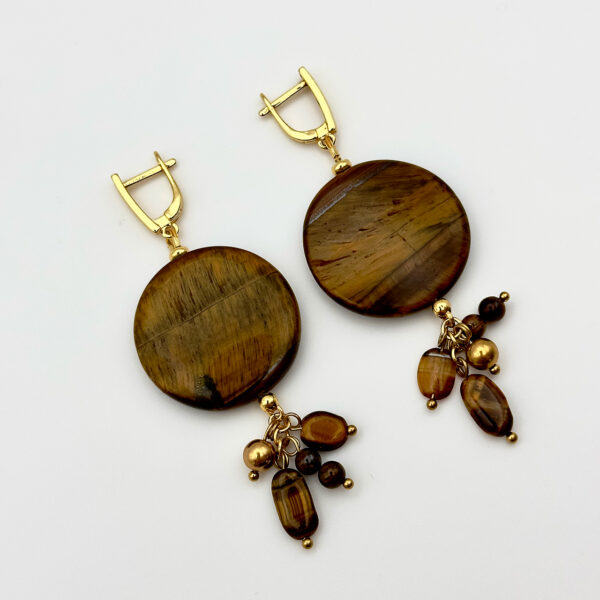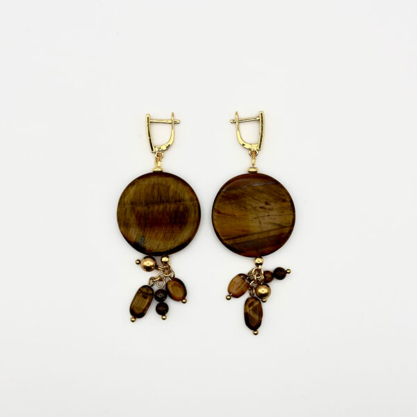 Сережки з колекції Gifts of Nature з намистинами з тигрового ока підкреслюють глибину природної краси. Теплі коричневі відтінки з характерним “котячим” відблиском створюють шляхетний акцент, а фурнітура кольору золота 24К надає м’якого світіння і завершеності образу.