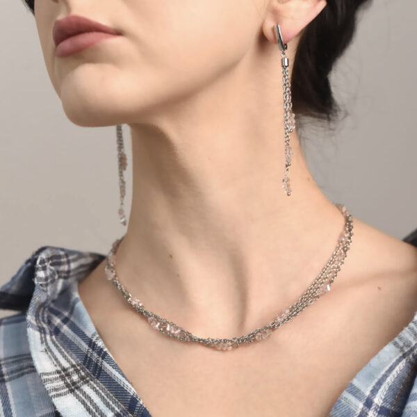 Сережки з колекції Past. Now. Forever. поєднують романтику минулого і сучасну елегантність. Рожеві намистини зі скла в поєднанні з родієвою фурнітурою створюють м’який і витончений образ. Прикраса наповнена легкістю і світлом, підкреслюючи жіночність і ніжність стилю.