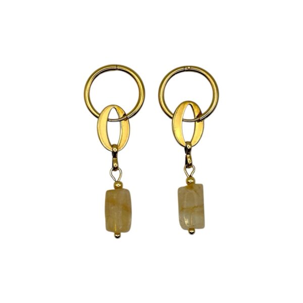 Сережки з колекції Raw Beauty з намистинами з цитрину і металу підкреслюють автентичність природної текстури. Теплий жовтий відтінок каменю сяє в золотому покритті 24К, а форма конго робить модель зручною та універсальною. Прикраса виглядає сміливо і сучасно, зберігаючи природний характер.