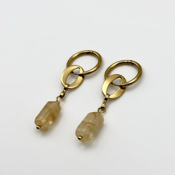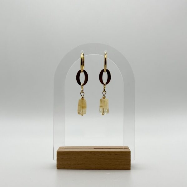 Довжина – 5,5 см, вага – 6,7 г, застібка – конго; металеві елементи забезпечують міцність і комфорт. Концепція Raw Beauty заснована на природній красі: цитрин символізує радість і удачу, його жива структура відбиває світло м’якими переливами. Металеві акценти формують ритм, балансуючи природну грубість каменю з сучасним дизайном.