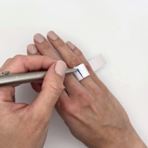 - Відзначте місце стику ручкою або фломастером на обох сторонах, розправ смужку або нитку і виміряй її довжину в міліметрах між двома позначками – це окружність пальця.